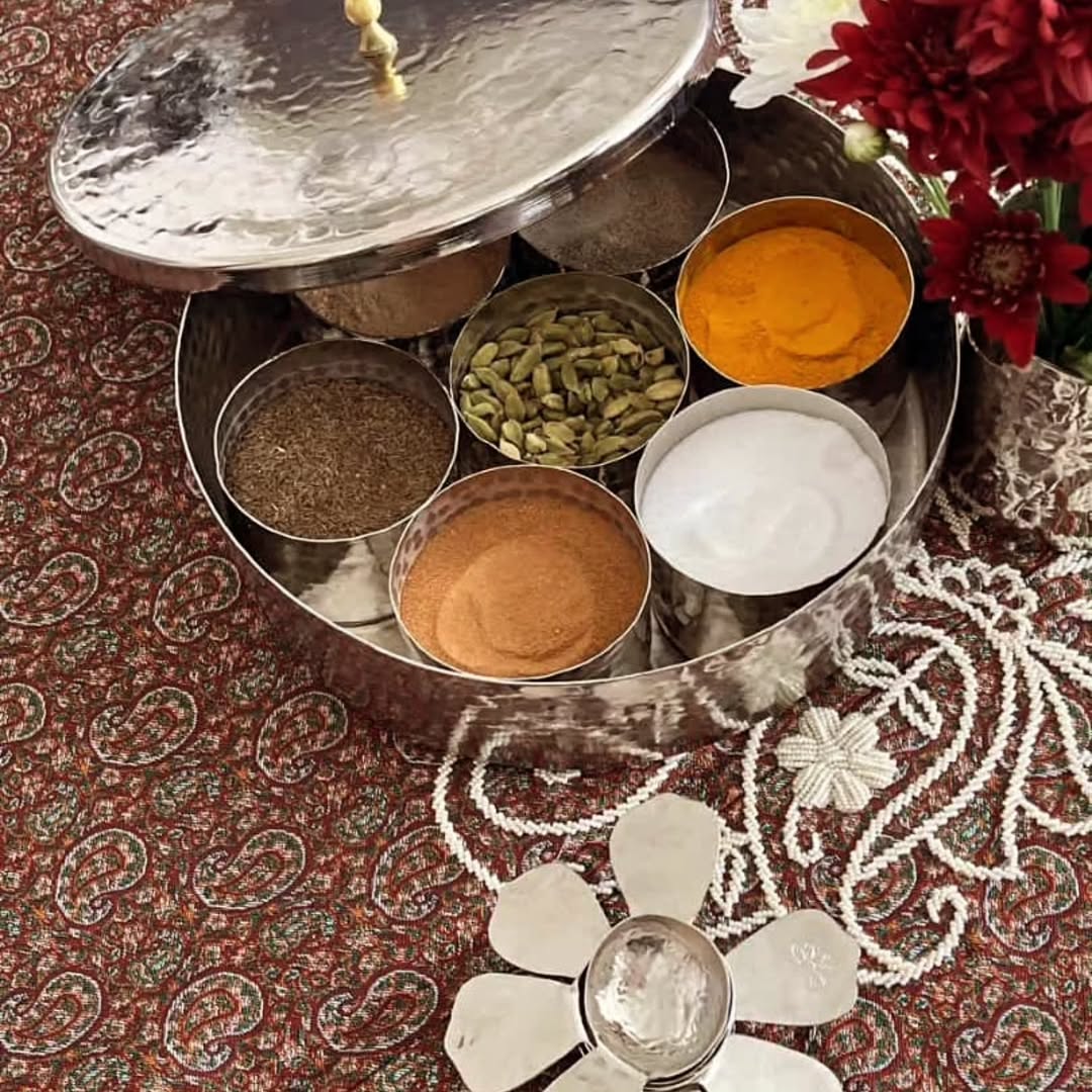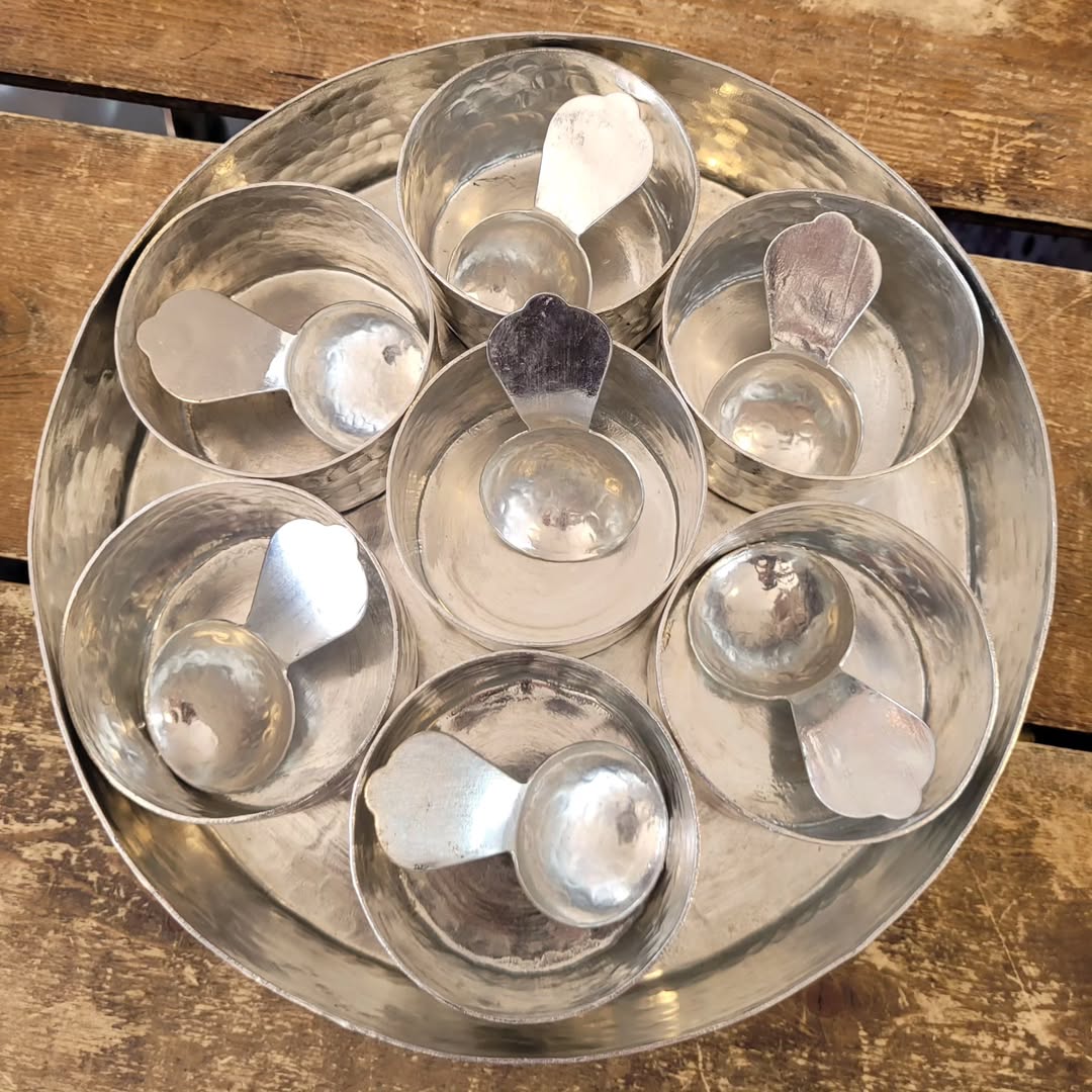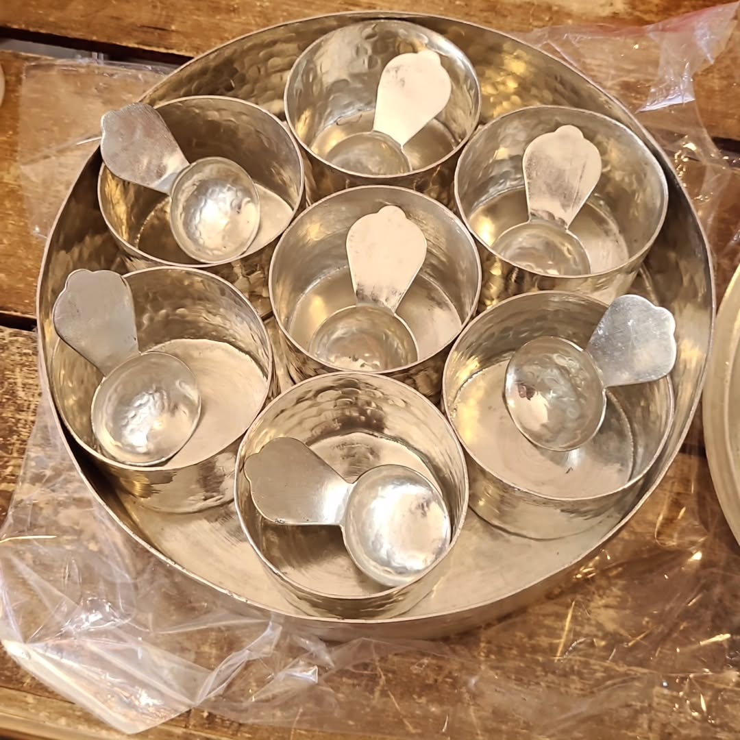 دست ساز های مسی خوشگل با کیفیت عالی و ۲ طرف قلع شده شامل ۷ عدد پیاله کوچک و ۷ عدد قاشق یک جعبه گرد درب دار تمام مس چکش کاری شده هنر دست